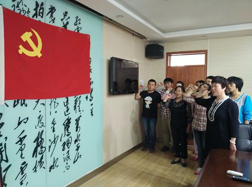 庄严的国际歌结束后,王萍带领研究生支部与管理支部全体新党员在鲜艳的党旗下庄严宣誓,参加会议的全体党员重温了入党誓词。