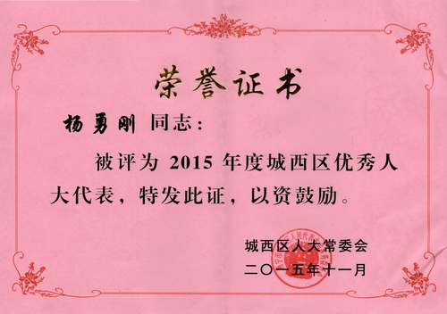 杨勇刚自2011年任城西区人大代表以来,恪尽职守,认真履行人大代表职责,自觉践行科学发展观,依照宪法和法律赋予的职权,紧紧围绕城西区中心工作和人民群众关心的热点、难点问题,在人民代表大会和闭会期间,建言献策,积极参加视察、检查和调研等活动,促进了城西区民主法治建设和经济社会各项事业的持续和谐健康发展。