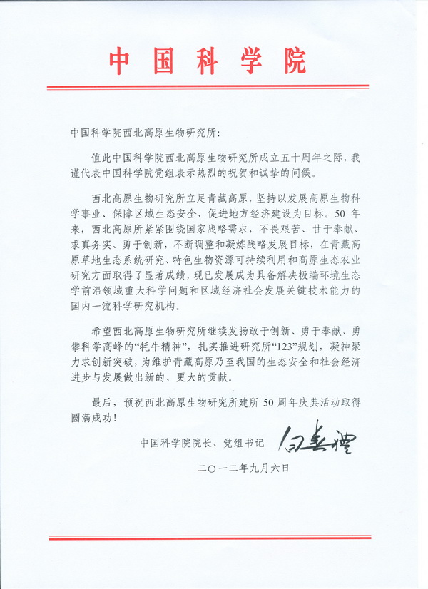 白春礼院长贺信