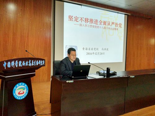12月20日上午,中国科学院西北高原生物研究所党委为深入学习宣传贯彻十八届六中全会精神,特邀中共青海省委党校副校长、教授马洪波为全所党员作题为“坚定不移推进全面从严治党”的专题报告。报告会由党委书记、所长张怀刚主持,党委委员、副所长陈世龙,副所长魏立新及在所党员90余人参加了报告会。