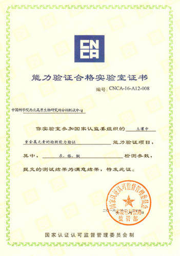 2016年12月26日,中国科学院西北高原生物研究所分析测试中心顺利通过了国家认证认可监督管理委员会(CNCA)组织的土壤中重金属检测能力验证。