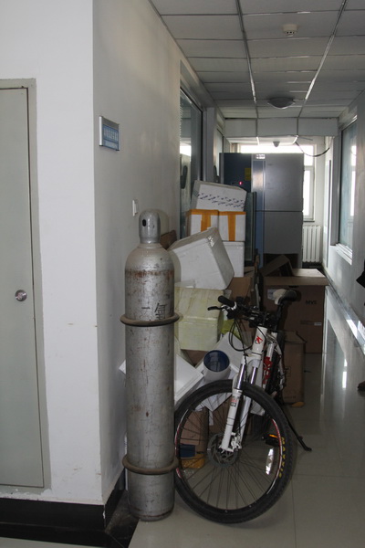 在检查中发现,由于原藏药楼的拆除导致办公和实验室面积压缩,野外实验样品和实验用品等被暂时摆放于门厅、楼梯间、公共区域等堵塞消防通道情况仍然存在。随着高原生物与农业技术自主研发能力和综合保障条件建设项目的投入使用,这一问题会得到解决。