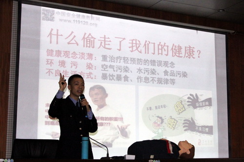 培训由中国安全健康教育网青海站彭加金老师进行,宣讲内容涉及四方面:1.突发事故公共卫生安全事件的应急处理;2.健康的生活方式;3.常见职业疾病的预防和改善及亚健康的综合治理;4.PM2.5雾霾空气污染的危害以及健康防护。