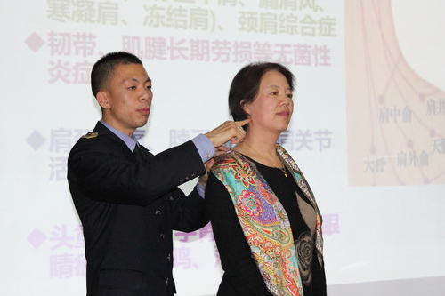 随后老师也有侧重地讲解了常见职业疾病的预防和改善及亚健康的综合治理,特别介绍了针对高血压、肩周炎、颈椎病、腰间盘突出等常见职业病的相应经络穴位与日常性锻炼,获得与会人员的一致好评。