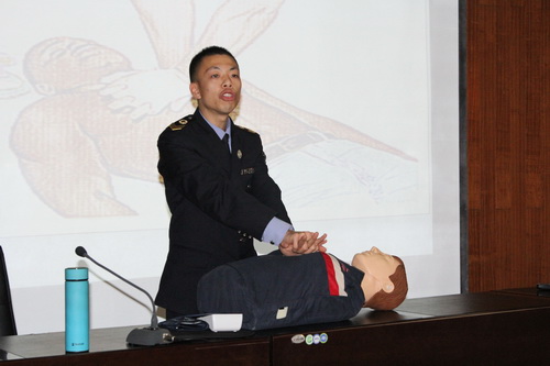 为普及急救知识,掌握急救技能,增加应对突发事件意外伤害的知识和能力,老师首先针对突发事故公共卫生安全事件的应急处理进行讲解,重点针对院外急诊、心肺复苏、人工呼吸等情况进行讲解。老师在介绍急救的要点时,借助假人道具进行演练示范,分析解释各个步骤。