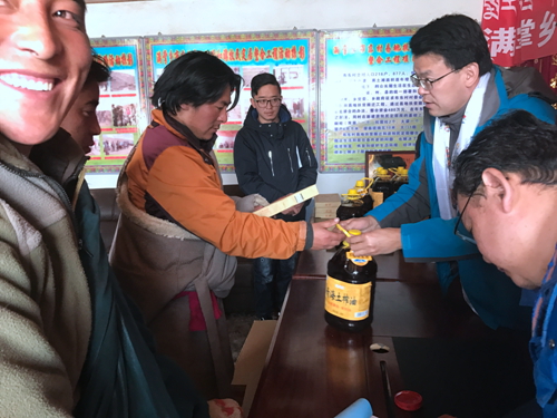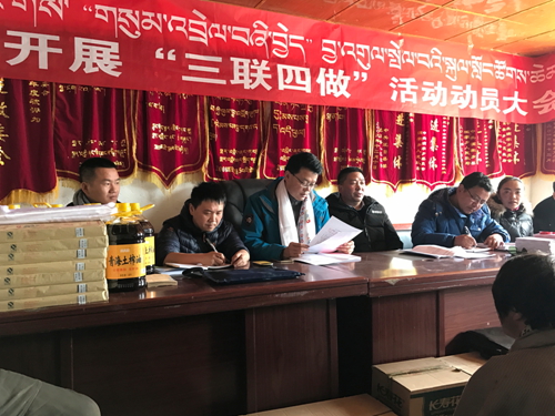 3月5日,宣讲扶贫组与县扶贫局干部、乡领导、扶贫干事等赴布东村,召开了“三联四做”宣讲动员大会,布东村村委、牧户代表等参加了会议。会上,魏立新向牧民群众宣讲国家支持藏区发展的各项利民惠民政策,主要包括农牧业支持保护补贴、草原奖补、精准脱贫、“三权分置”、农村低保、新型经营主体以及生态建设、农牧业供给侧结构性改革等,使牧民群众进一步了解党的各项方针政策。会后,宣讲扶贫组给满掌乡政府送上党建慰问金5000元,并在乡级干部的带领下,宣讲扶贫组走访了布东村驻村(扶贫)队员“结对认亲”一对一帮扶的14户贫困户,为每户送上慰问金200元和慰问品(菜籽油、砖茶等),共计5000元。此次宣讲帮扶活动,进一步融洽了与帮扶牧民的关系,增强了党和政府在群众心目中的凝聚力,让贫困牧民感受到国家对他们的关怀和温暖。