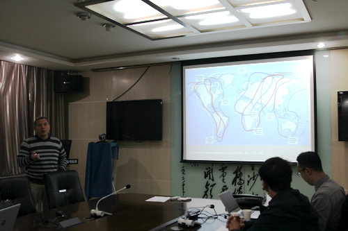 其次,Shestopalov Alexandr及Yurlov Alexandr分别就2016年俄罗斯境内发现的H5N8禽流感病毒的检测和流行以及俄罗斯西伯利亚南部和西部地区鸟类的的繁殖、迁徙及保护等科学问题做了介绍。动物与病原体协同进化-生态-行为与免疫学科组博士王稳与其进行了交流探讨,并重点介绍了动物与病原体协同进化-生态-行为与免疫学科组在对青海湖鸬鹚进行GPS定位方面的工作及所取得的成果。