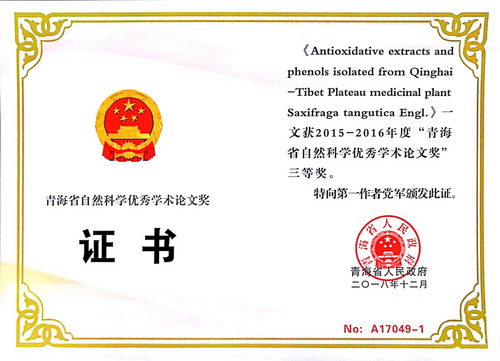 中国科学院西北高原生物研究所助理研究员党军的论文“Antioxidative extracts and phenols isolated from Qinghai–Tibet Plateau medicinal plant Saxifraga tangutica Engl.”荣获2015-2016年度青海省自然科学优秀学术论文三等奖。同时,我所2016届博士研究生任飞的论文“Contrasting effects of nitrogen and phosphorus addition on soil respiration in an alpine grassland on the Qinghai-Tibetan Plateau”荣获2015-2016年度青海省自然科学优秀学术论文二等奖,特此祝贺!