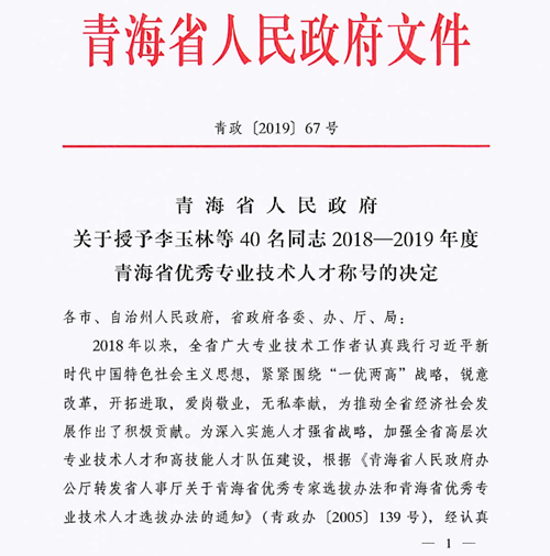 李玉林研究员荣获青海省优秀专业技术人才称号