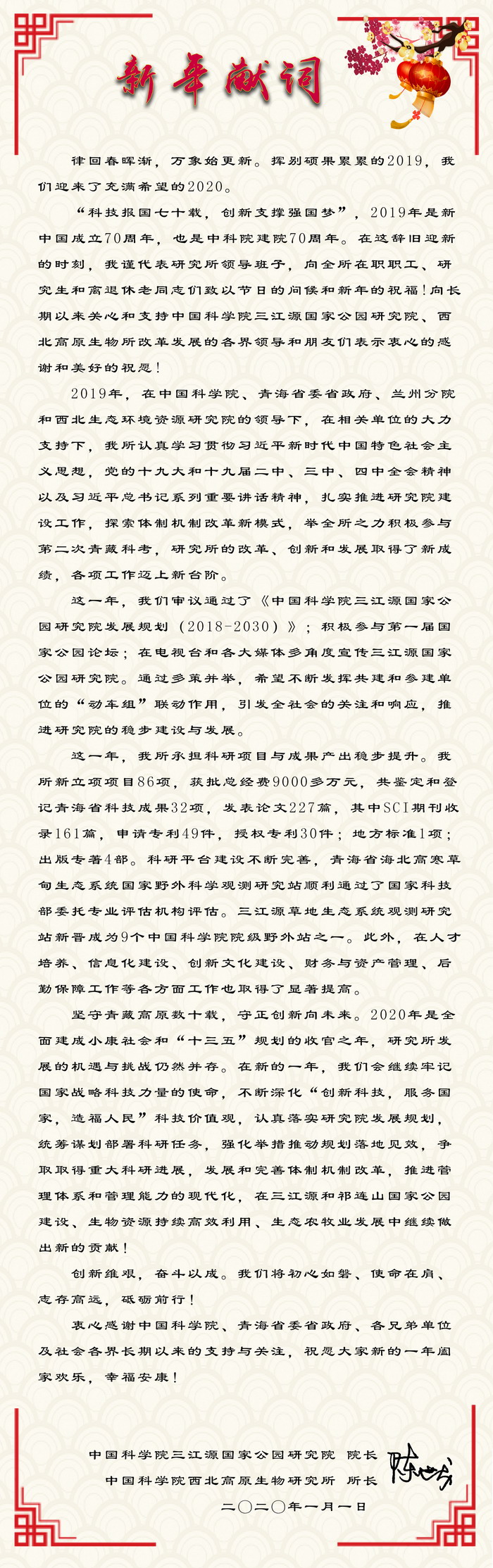 来自中国科学院三江源国家公园研究院院长的新年献词