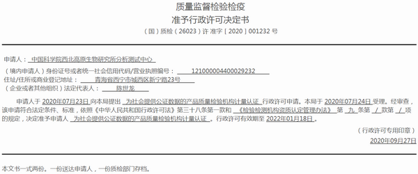 9月27日,中国科学院西北高原生物研究所分析测试中心获得了由国家市场监督管理总局下发的质量监督检验检疫准予行政许可决定书[(国)质检(26023)许 准字[2020]001232号]。依照《中华人民共和国行政许可法》第三十八条第一款和《检验检测机构资质认定管理办法》第九条的规定,准予分析测试中心为社会提供公证数据的产品质量检验机构计量认证。