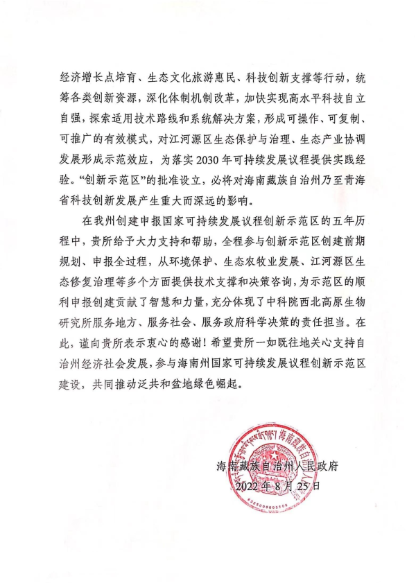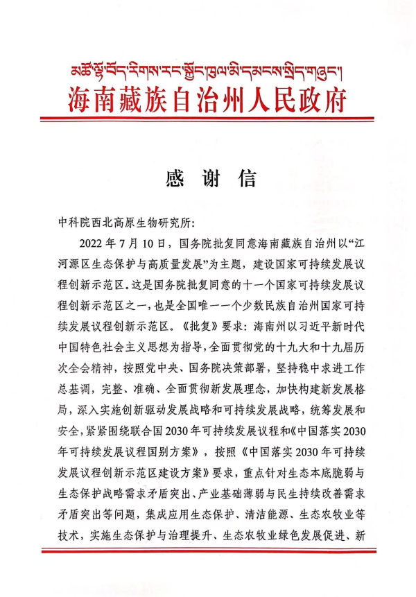 海南藏族自治州人民政府致西北高原所的感谢信