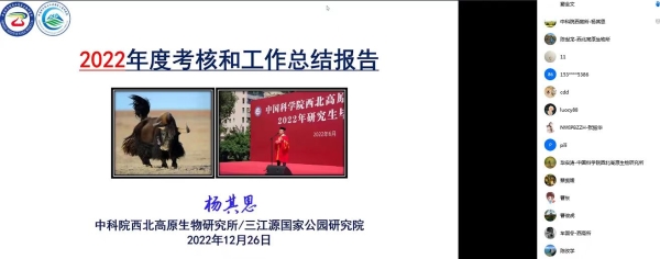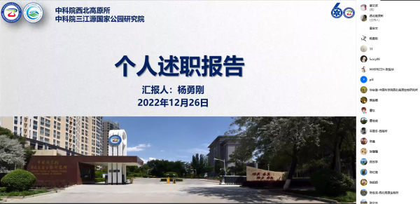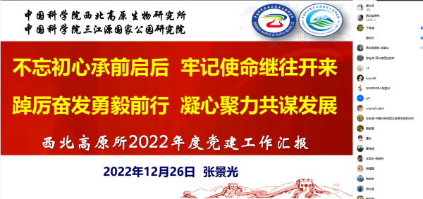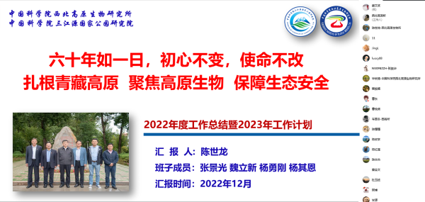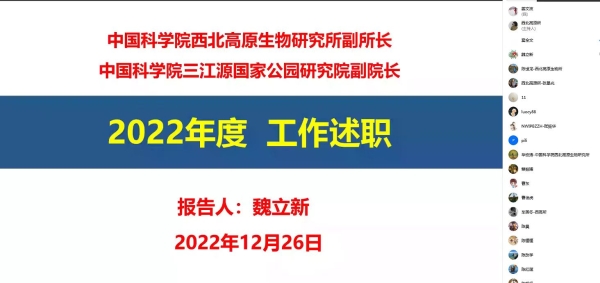 12月26日上午,中国科学院西北高原生物研究所(中国科学院三江源国家公园研究院)线上召开了2022年度工作总结暨领导班子考核会,中科院兰州分院分党组书记、院长冯起,分党组副书记陈改学,中科院西北生态环境资源研究院党委副书记、纪委书记王萍等,西北高原所所长陈世龙,党委书记、副所长张景光,副所长魏立新,党委副书记、纪委书记杨勇刚,副所长杨其恩及全所在职职工、研究生和离退休职工代表参加了会议。会议由陈世龙主持。