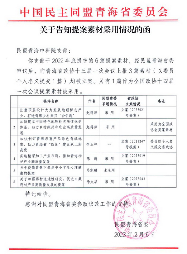 近日,从民盟青海省委回函获悉,民盟青海中科院支部于2022年提交的4件提案被采纳,其中《加快建立中国特色地理标志法律保护体系 助力乡村振兴和农业高质量发展》被民盟青海省委采纳为全国政协十四届一次会议提案素材。其余3件提案《注重顶层设计大力发展地理标志产业 打造青海乡村振兴“金钥匙”》《实施精深加工产业布局 推动青海枸杞产业高质量发展》《加强药材道地性研究促 进中藏药材产业高质量发展》 经民盟青海省委遴选上报青海省政协十三届一次会议,获得立案。