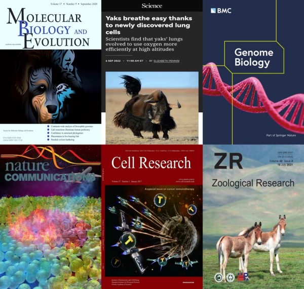 以“三代+二代+Hi-C”策略,构建了野牦牛和家牦牛染色体水平高质量参考基因组,结合多组学数据发现了牦牛适应青藏高原极端环境的一种新机制,相关成果发表在 Nature Communications,同时被 Science、新华社等多家媒体平台报道。通过雪豹参考基因组及种群重测序数据,发现青藏高原存在南北两种雪豹亚型,与其猎物分布较为一致,为青藏高原物种遗传多样性及适应提供了新的见解。另外,团队发现高原鱼类演化历史与青藏高原地质事件相关,濒危鱼类经历了全基因组复制,加倍基因主要富集于DNA修复,转运等与高原环境适应相关通路,研究结果将有助于进一步研究高原鱼类的适应性进化,并为鱼类的耐逆分子育种提供素材。