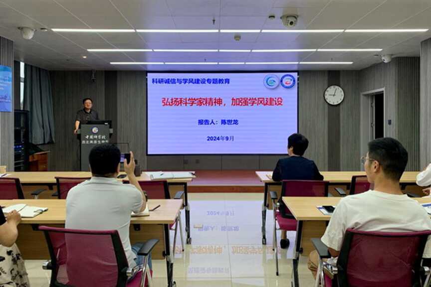 上午,入所教育在庄严的国歌声中拉开序幕。陈世龙首先致辞,他代表研究所向新同学、新职工的加入表示热烈欢迎,希望他们能够尽快适应研究所的学习、工作氛围,投入科研学习、工作与生活。之后,他为研究生和新职工作了“弘扬科学精神,加强学风建设”专题报告,报告从讲述我国百年科技发展史、中国科学院发展历程、新时代科学家精神的传承与发展、科研道德与学风建设、学术规范与学术道德等方面展开,阐述了科学成就离不开精神支持的道理,倡议大家学习传承老一辈科学家精神、弘扬新时代科学家精神,让科学发展成为指引、让科学精神照亮征程、让科技创新充满激情、让科学领域更加纯净、让科学普及成为使命。