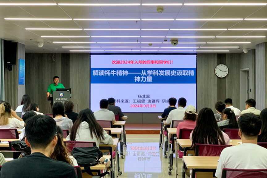 杨其恩作了“解读牦牛精神——从学科发展史汲取精神力量”专题报告,报告从回顾研究所的发展历程为切入点,向大家讲述了“牦牛精神”蕴含的深刻意义和背后历经曲折、卓越坚守、不计报酬、但求贡献的过往,希望作为“国家队”、“国家人”的新生力量,大家能够保持真诚与谦卑,抱利他之心、行利他之事,能够心系“国家事”、肩扛“国家责”,面向国家需求、结合个人兴趣,承先生前辈之创造、开科研范式变革之新局,做“牦牛精神”忠实地践行者。