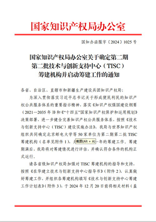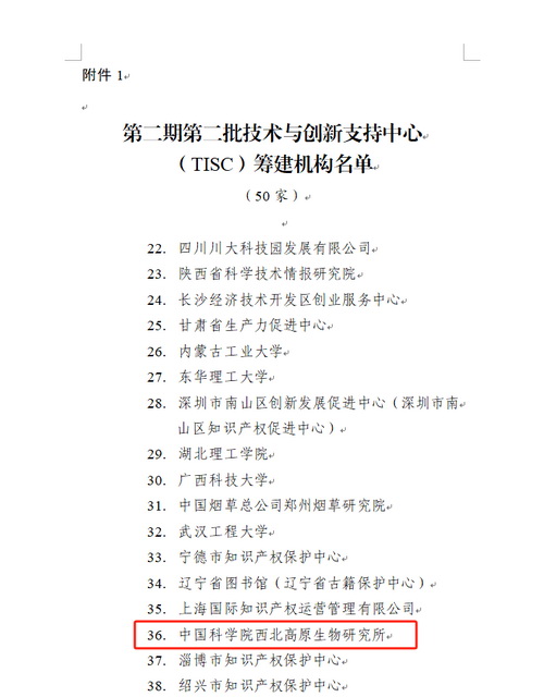 近日,国家知识产权局发布了《国家知识产权局办公室关于确定第二期第二批技术与创新支持中心(TISC)筹建机构并启动筹建工作的通知》(国知办函服字[2024]1025号),中国科学院西北高原生物研究所被国家知识产权局和世界知识产权组织(WIPO)共同确定为技术与创新支持中心(TISC)筹建机构。一年筹建期满后,经评估符合条件可正式运行。