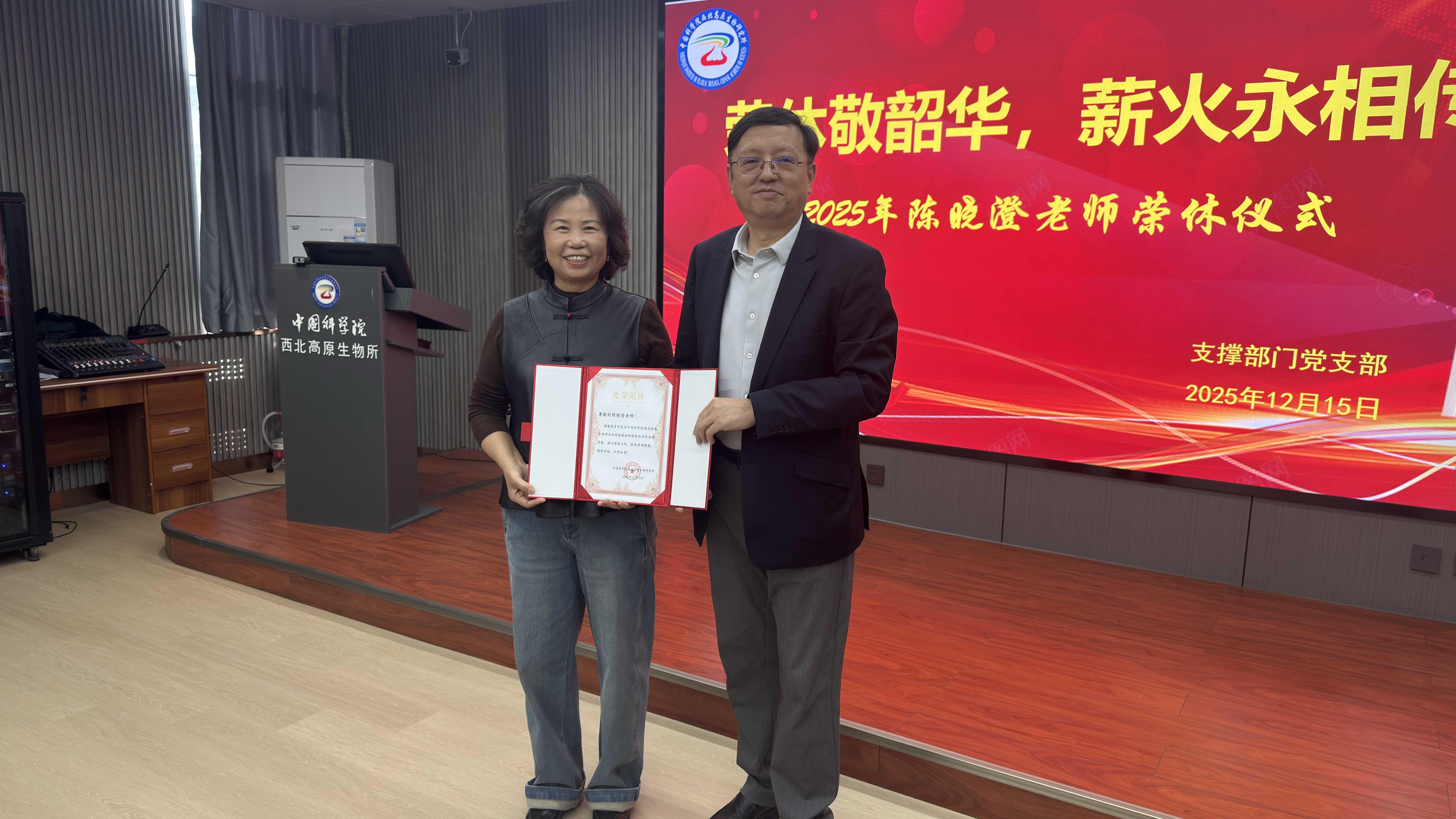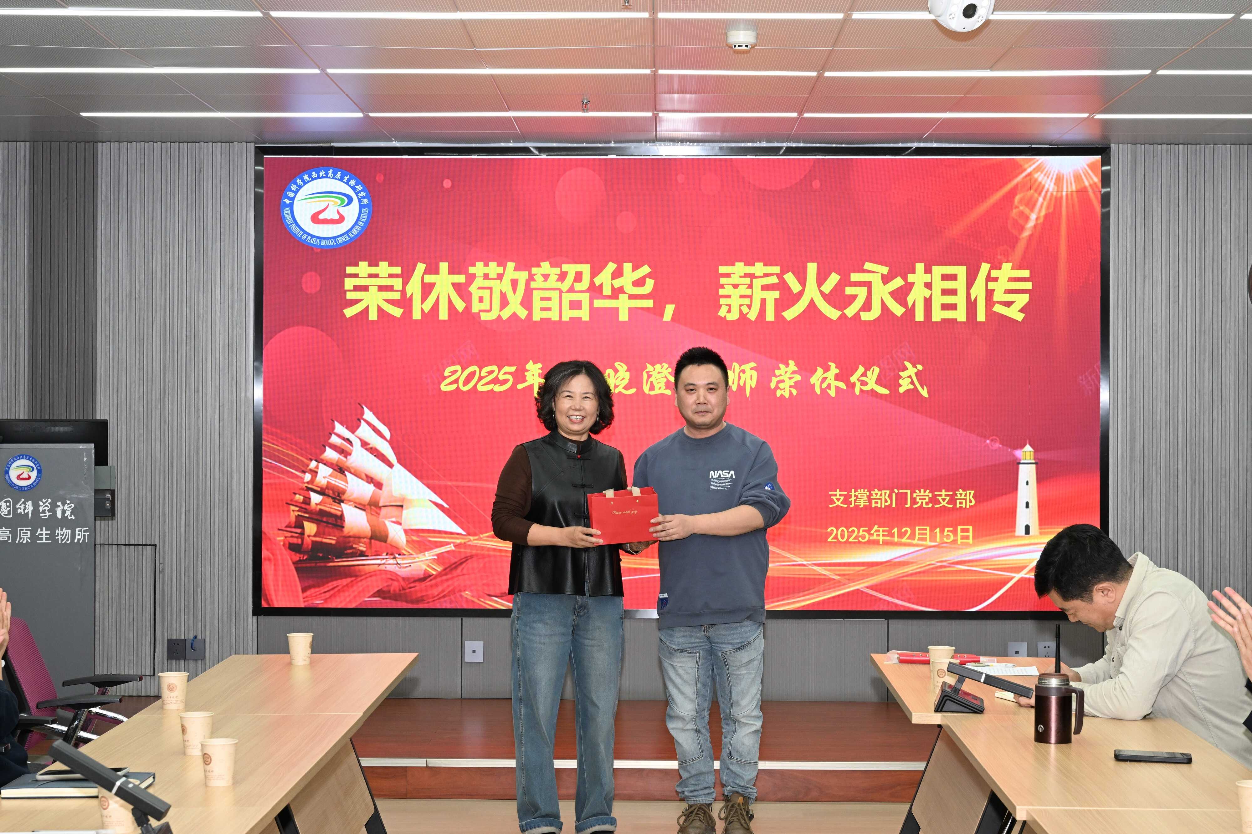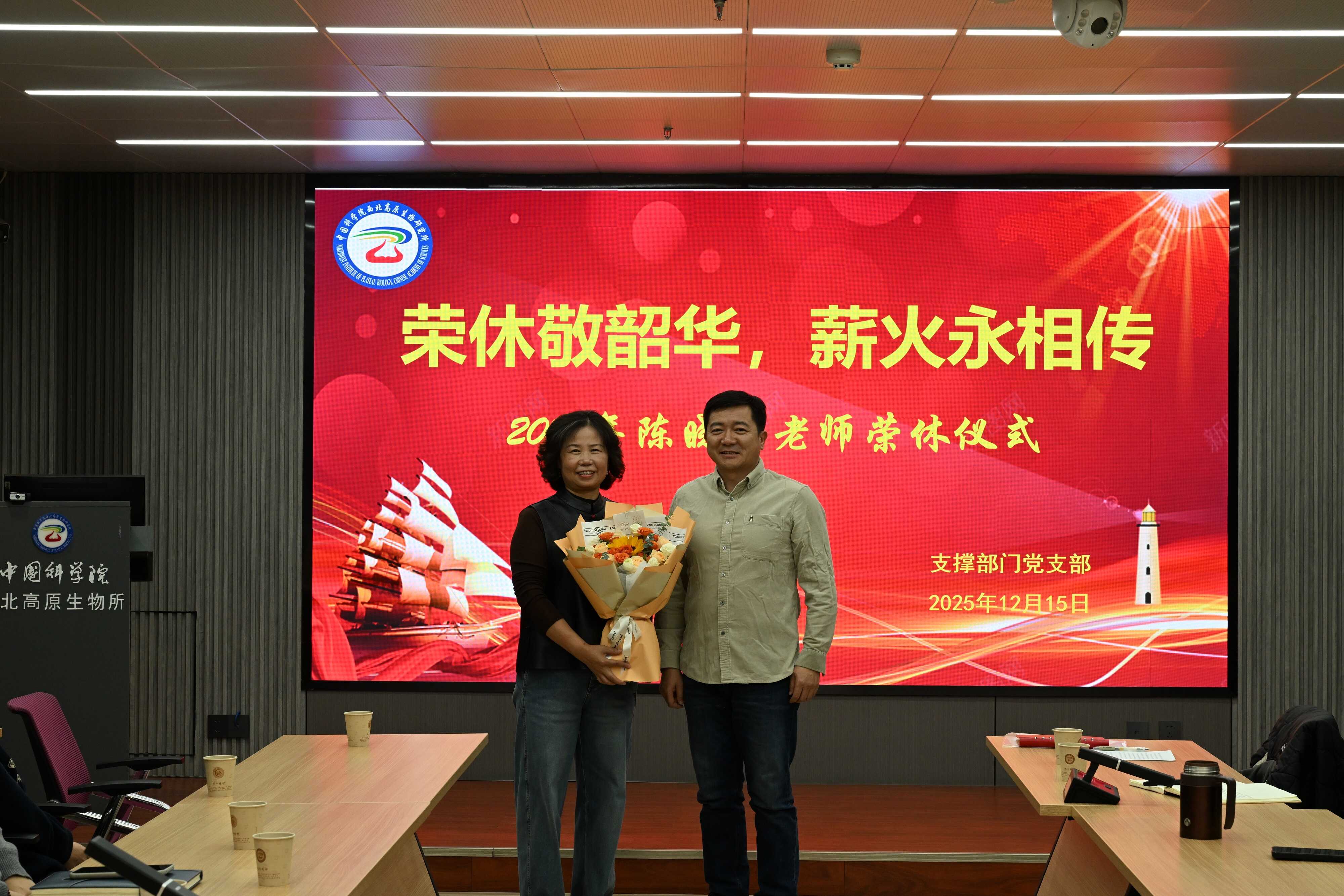 荣休敬韶华,薪火永相传。12月15日下午,西北高原所支撑部门党支部精心筹备,为青藏高原生物标本馆高级工程师陈晓澄隆重举办荣休仪式。所长、党委书记陈世龙,副所长杨其恩,人事教育处副处长杨红霞,财务处处长赵海燕,条件保障处处长魏铄欢,荣休职工陈晓澄及支撑部门、生态中心、管理部门等在职职工齐聚一堂,共忆奋斗岁月,共话深厚情谊,共送美好祝福。活动由支撑部门党支部书记赵静主持。