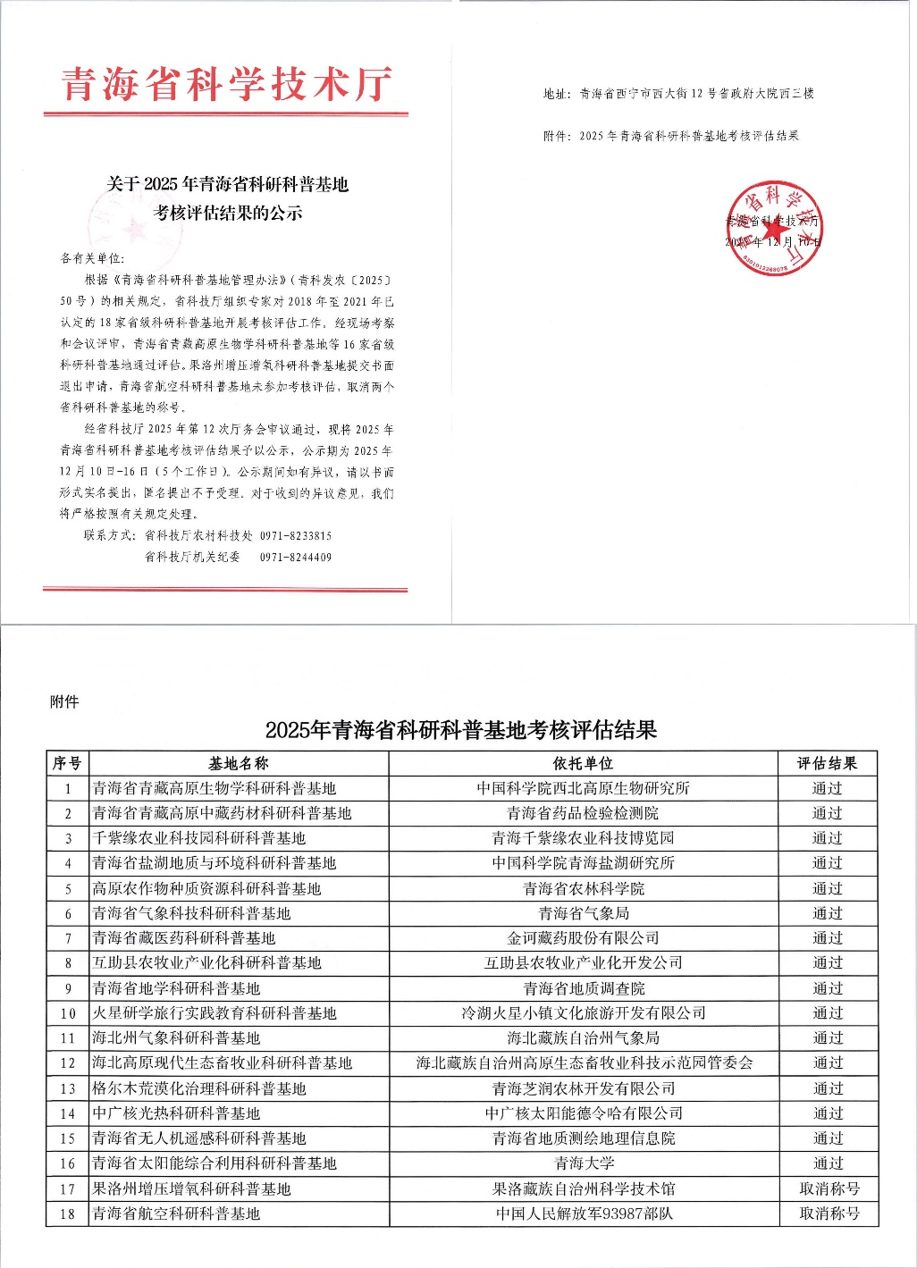 省科技厅关于2025年青海省科研科普基地考核评估结果的公示