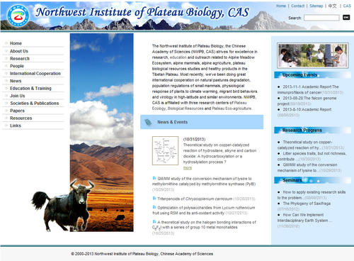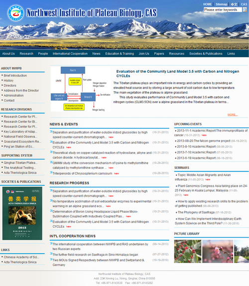 中国科学院西北高原生物研究所网站英文版(http://english.nwipb.cas.cn/)于2009年7月完成,上线后年访问人次在1万左右,年浏览量为18万左右,其中境外访问量占56%,对西北高原所进行了较好的宣传。