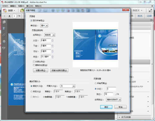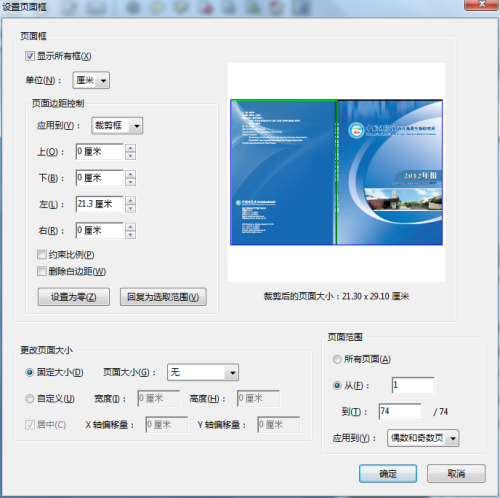 打开文件,点击右上角的工具栏“工具”,“页面”中的“剪裁”。先剪裁掉右边的单页,在剪裁页的下面“右”输入宽度的一半数值。右下部应用到所有页。