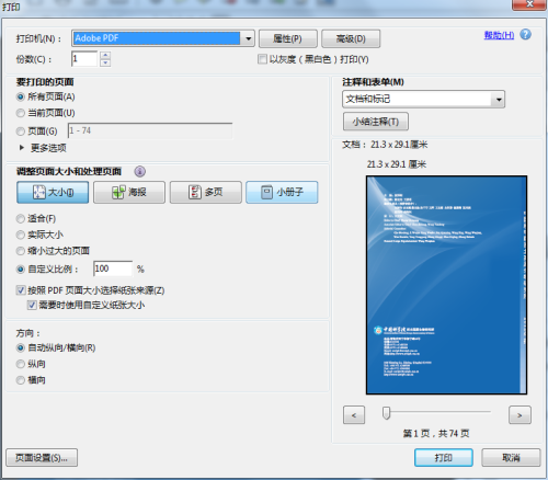 然后选择Adobe PDF打印机打印,页面大小选择“自定义比例”,按照PDF页面大小选择纸张来源、需要时使用自定义纸张大小前面的勾都勾上。