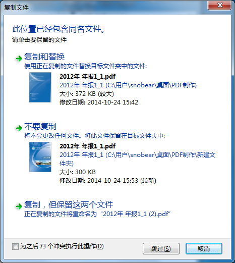 勾选下面的“为之后N个冲突执行此操作”,点击“复制,但保留这两个文件”,得到下面类似的文件。以上操作的目的是为了自动从小到大排列页面。