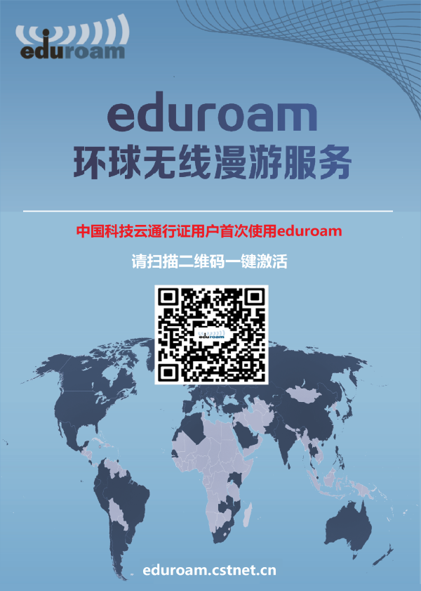 eduroam(education roaming)是专为科研和教育机构开发的安全的环球跨域无线漫游认证服务,现已覆盖全国68个研究所和168所大学,全球覆盖七十余个国家和地区的超过6000家科研机构和教育机构。加入eduroam联盟的机构成员可使用本机构提供的合法账号,在全球已加入eduroam联盟的机构内实现无线网络访问的无障碍漫游。