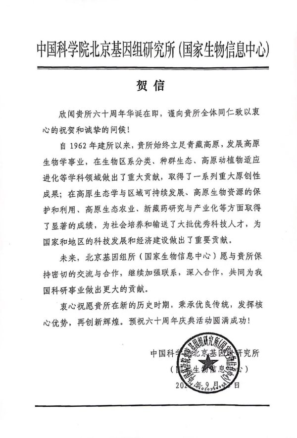中国科学院北京基因组研究所(国家生物信息中心)贺信