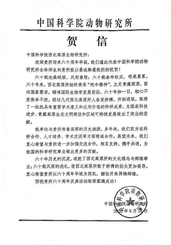 中国科学院动物研究所贺信