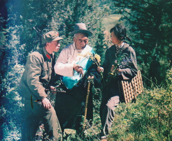 1968年西北高原所的科研人员积极响应伟大领袖毛主席的号召,大搞藏药和中草药调查。图为何廷农(右一)与青海省独立师战士一起在野外采集标本,并访问老藏医