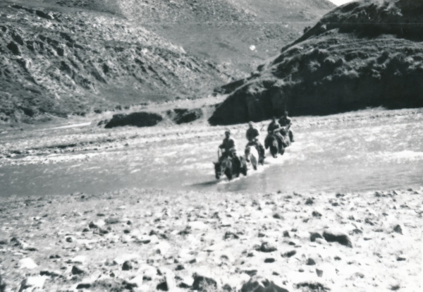 1974年科考队员在阿尼玛卿山脚下骑马过河的情景