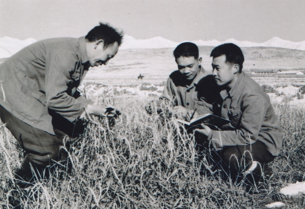 1980年沙渠(左)韩永才(右一)和何玉珠在测定人工草地植物生长情况