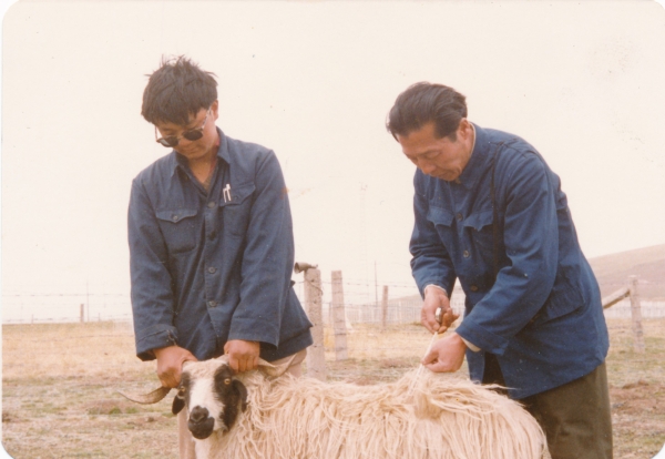 1985年海北站承担高寒畜牧区优化放牧实验。图为皮南林(右一)和张堰青在测定藏系绵羊的毛长