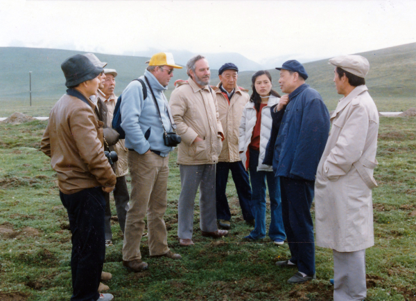 1986年7月海北站成立十周年,夏武平先生向外国专家介绍海北站从事生态系统研究工作的进展情况