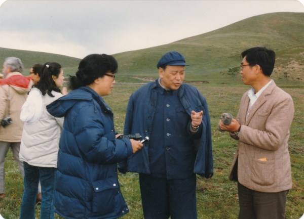 1986年7月海北站成立十周年,夏武平先生向青海电视台记者介绍海北站的研究工作(右一为张文须)