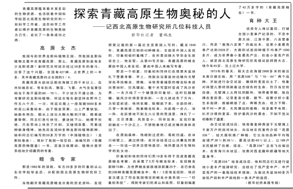 青藏高原蕴育着丰富多彩的生物资源,也活跃着中国科学院西北高原生物研究所的一批科学工作者。这些科学工作者以揭开青藏高原的生物奥秘为己任,走出了一条条成功之路。