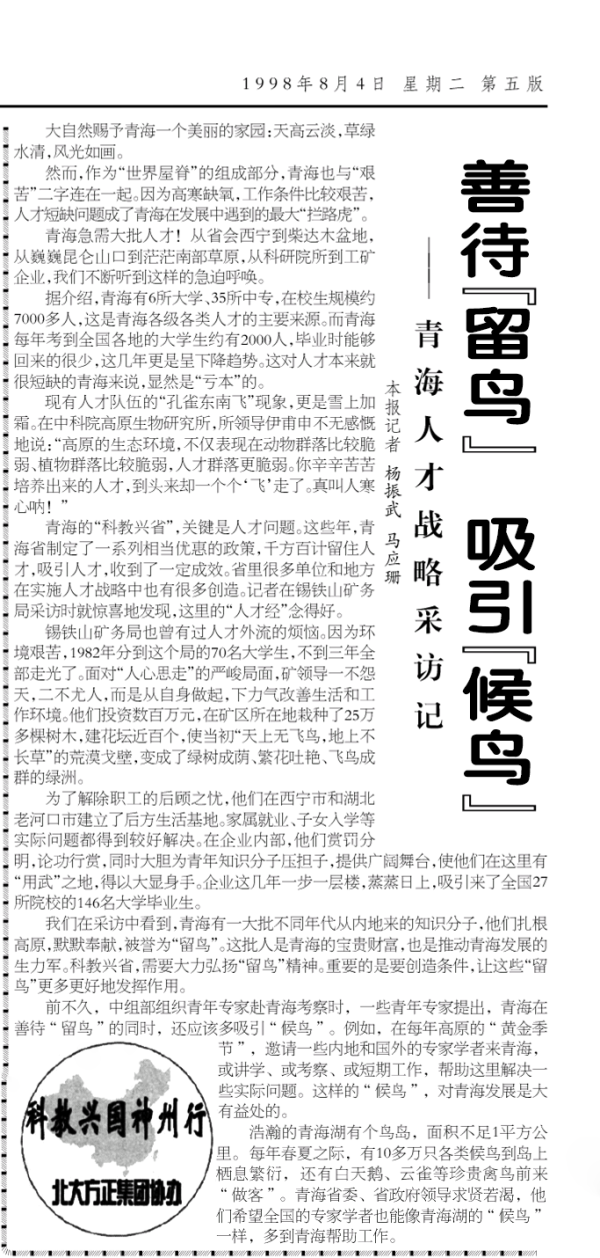 我们在采访中看到,青海有一大批不同年代从内地来的知识分子,他们扎根高原,默默奉献,被誉为“留鸟”。这批人是青海的宝贵财富,也是推动青海发展的生力军。科教兴省,需要大力弘扬“留鸟”精神。重要的是要创造条件,让这些“留鸟”更多更好地发挥作用。