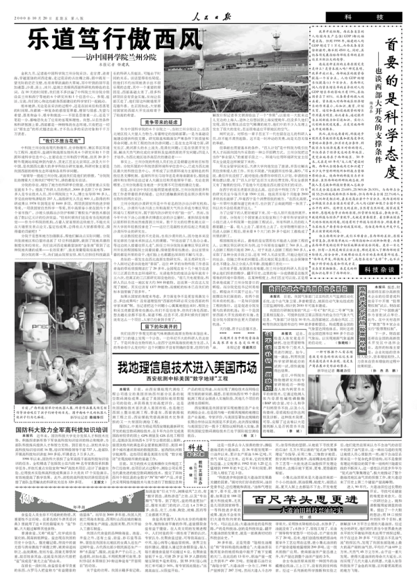 金秋九月,记者赴中国科学院兰州分院采访。走甘肃、进青海,穿越富饶的河西走廊,走过荒凉的古丝绸之路,眼中既有一望无际的茫茫戈壁,也有青翠欲滴的大草甸,耳中听到的却尽是加速器、沙漠、冻土、冰川、盐湖之类颇具西部科研机构特色的名词。在10天的时间里,我们差不多访遍了中科院兰州分院分别设在兰州和西宁等地的6个研究所和1个信息中心,参观、座谈、交流,我们的心和这些献身西部建设的科学家们一起跳动。