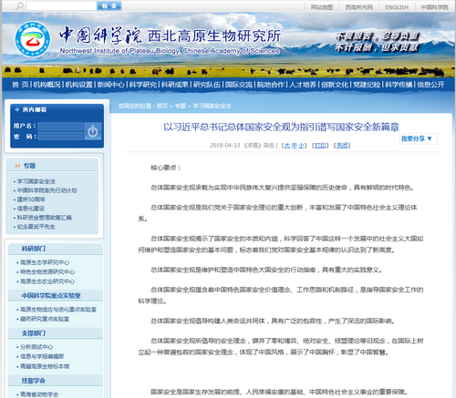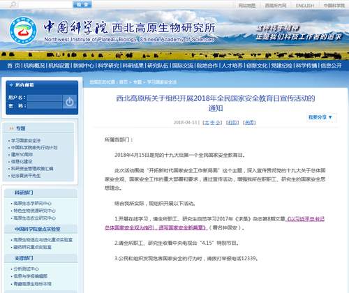 结合中科院西北高原生物研究所实际情况,所办公室在网站主页增设浮动窗口,专题链接国家安全法有关内容;下发通知.开展在线学习2017年《求是》杂志第8期文章《以习近平总书记总体国家安全观为指引,谱写国家安全新篇章》(署名钟国安);组织科研人员和研究生收看中央电视台“4.15”特别节目。