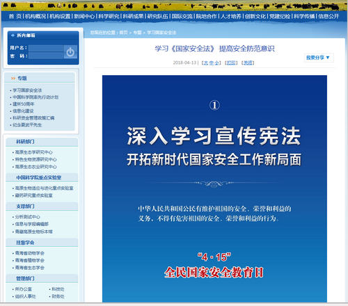2018年4月15日是党的十九大后第一个全民国家安全教育日。根据中科院办公厅及青海省普法办安排,此次活动围绕“开拓新时代国家安全工作新局面”这个主题,深入宣传贯彻党的十九大关于总体国家安全观、国家安全工作的重大部署和要求,通过宣传活动,增强我单位科研人员和学生的国家安全思想理念。不断增强广大群众国家安全法律知识,增强国家安全意识,维护国家安全,推动国家安全宣传教育工作深入开展。