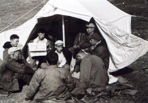 上世纪六十年代考察队在帐篷中读报学习