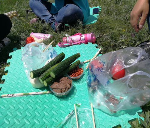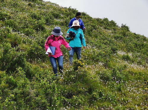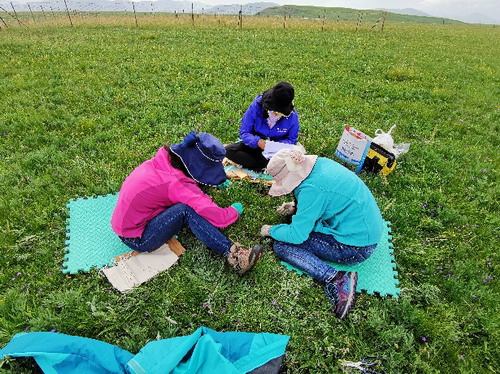 7月27日,多云,一个非常适合做调查的好天气。早晨8点钟简单吃过早饭,我们就出发前往第一个主样点。我们只有主样点的经纬度坐标,一路各种寻找。青藏高原山较多,如果根据经纬度去陌生的地方,万一走错路会耗费大量的时间。地图上明明显示样点离你不到100米,你却只能站在山脚下望顶兴叹。还好这次遇到的坡不大,我们把车停在路边,几个人带着采样装备爬了500米左右的坡,作为领队顾不上休息,给大家简单讲解一下采样要求,迅速按照要求确定了样点。尽管我们只有五个人,大家根据特长迅速进行了分工。老杨比较仔细,做过标本负责压制标本。小李喜欢拍着,负责植物的拍照工作。卓玛措是个本地的藏族学生很是认真,负责植物标本的采集。而我因为认识大部分植物,又对调查工作熟悉,除了总指挥还负责各种植被的测量调查工作。完成之后下午一起进行样方植物分种工作。也许因为喜欢这些花花草草,我是个对于野外植物分种有极大耐心的人。而对于其他人员就没有这么容易了,因为不太认识草,你要趴的很低才能分辨,而草长得很矮,只能在草地上利用各种瑜伽动作才能将草一株一株的分开。我们经常调侃野外植物分种是一项减肥运动,每次出一次野外每个人都会瘦几斤。7月的高寒草地是非常美丽的,很多植物都开着艳丽的花。我们小分队本着保质保量的原则,第一天共拍照并采集压制了50份植物标本,完成了两个样方的分种调查。晚饭过后,忍着一天的疲惫对采集的植物样品以及土壤样品进行了初步处理。整理完所有的记录表格,植物照片之后已经接近零点了。司机老杨是第一次跟我们跑野外,司机兼标本压制、土壤样品采集。一天的工作结束的时候,老杨给我们三个女将竖起了大拇指。老杨说没来之前,他以为我们的调查就是拍拍照、看看草,简直就和旅游一样,没想到我们这么辛苦。