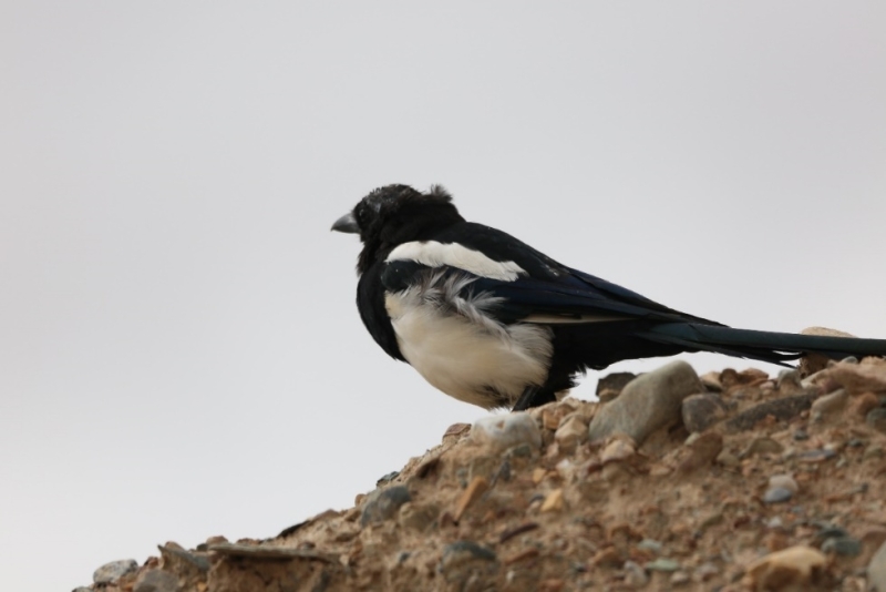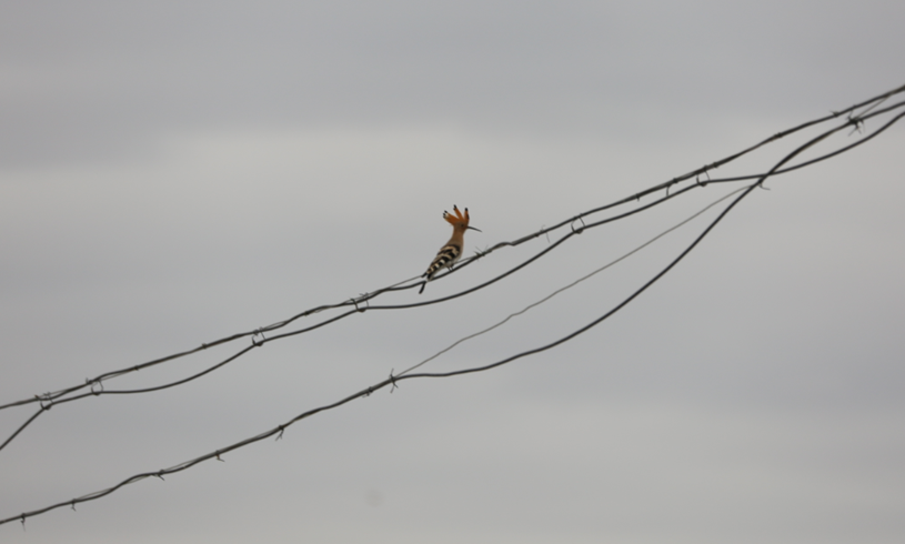 还未进入样方,在国道一侧的电线上伫立着的几个身影已令我们喜出望外,本以为又是一天的戈壁滩涂,没想到竟然途经了一小片湿地。戴胜、褐岩鹨、喜鹊、赭红尾鸲、棕尾鵟,在相隔不到20米的区域内,我们陆陆续续观察到了不少的鸟类。尤其是棕尾鵟,当我们的车向它靠近的时候,猛然从杆上展翅飞起,在空中翱翔的潇洒身影,令人见之难忘。作为鹰科鵟属的中大型猛禽,成年棕尾鵟体长一般在半米以上,成鸟的头部和颈部呈棕褐色,上体褐色,下体棕白色,与其他种类的鵟有所不同。相比于我们比较熟悉的大鵟,棕尾鵟的颈部和脚杆都更加修长一些,翅宽也比大鵟得要窄,显得格外苗条。