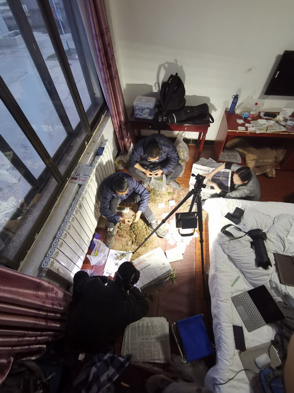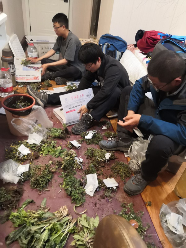 20:00 经过一天的调查,我们采集了大量的植物标本,压标本、翻标本和凉标本是我们每晚的保留节目。灯光、报纸、记录本分分就位,压制到凌晨成了我们的日常。
