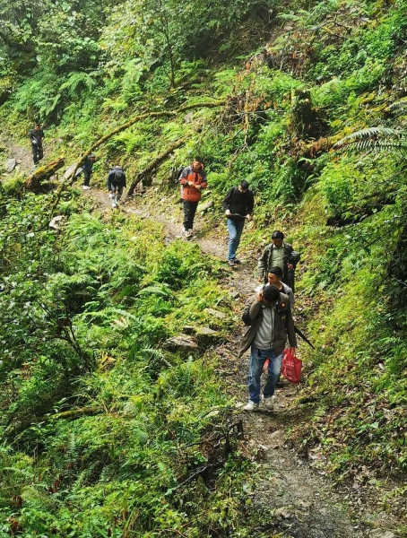 设计考察方案时,主要是依据魏立新研究员早在2004年只身前往尼泊尔考察采集印度獐牙菜种质资源和对其生长环境的考察成果并查找《西藏植被》等历史资料以及考察队员以前在该地区考察时对当地植被的认知等经验,预判在靠近尼泊尔边境的峡谷地区,相似的生态环境和植被类型中应该有所分布。因此本次考察选定了珠峰脚下峡谷地带的樟木沟、嘎玛沟、陈塘沟和吉隆沟四条沟布设样线进行考察。到达陈塘镇后,找到了当地民间藏医夏尔巴人拉巴,连夜进行了走访,通过座谈了解到当地确实有“甲蒂”、“旺拉”等藏药植物种的分布,这个消息使得考察队员异常兴奋,当即聘请他和他刚退役的侄儿巴桑做向导和翻译,约定第二天早上出发。兴奋之余我们也从拉巴那里得到了一个不好的消息,那就是“甲蒂”、“旺拉”的分布区不仅距离城镇远,道路崎岖,并且沿途旱蚂蟥很多。