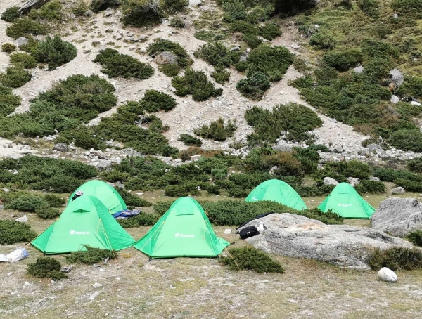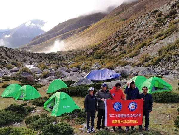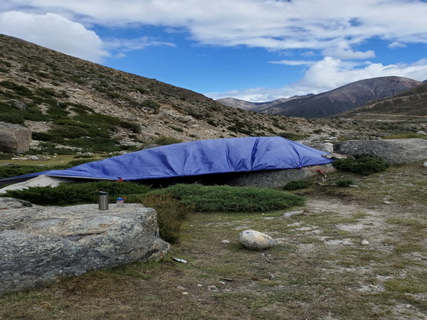被蚂蟥叮咬的多了,队员们也就不再惧怕,行进与考察途中不断从头上、脖子上、手腕处揪掉吸血的蚂蟥,继续工作。又经过3个小时的行走并完成了两个样方点的考察后,终于找到了一处海拔3700m相对平缓的山坡地带,于是考察队长魏立新研究员决定在此扎营。一部分队员负责扎营,另外一部分队员则继续向前考察,两位司机师傅则返回陈塘镇,于次日赶往曲当乡等待接应。