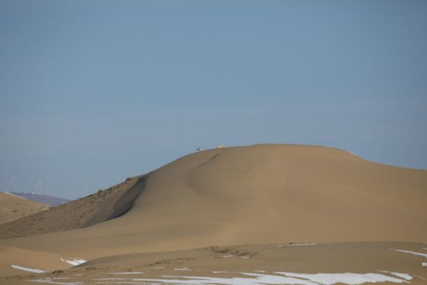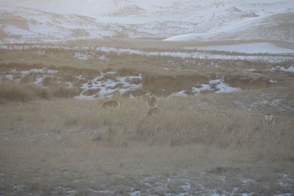 刚出日月山,就来到克图区域。道路左右两侧景观截然不同。道路左侧是高山草甸,覆盖着冰雪,在高山的阴影里,雪地泛着淡蓝的颜色;低处长着一丛丛的芨芨草墩,很容易被误认为是卧着普氏原羚。道路右侧则是高大辽阔的沙丘,一个连着一个;沙丘阴坡仍有积雪,一片雪白,阳坡则裸露出沙地,在朝阳的照耀下呈现一片金黄,雪白和金黄相间的沙丘景观甚是壮观。