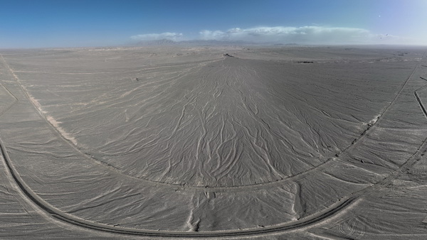 在海西蒙古族藏族自治州大柴旦镇北部鱼卡镇附近:我们通过无人机航拍发现,在雨量充沛的季节,经过地表径流冲刷,在这片荒凉的沙漠地貌上留下了树状分形的痕迹。听同行的司机师傅说,在不远处的山上生活着藏原羚,在下雪的天气,山上积雪无法获得食物,藏原羚就会成群结队下山来到这片荒漠地带刨土采食地下的植物根系,以此为生。